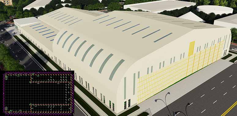 The facility includes maintenance areas, warehouse, workshop, offices, and supporting service spaces.
