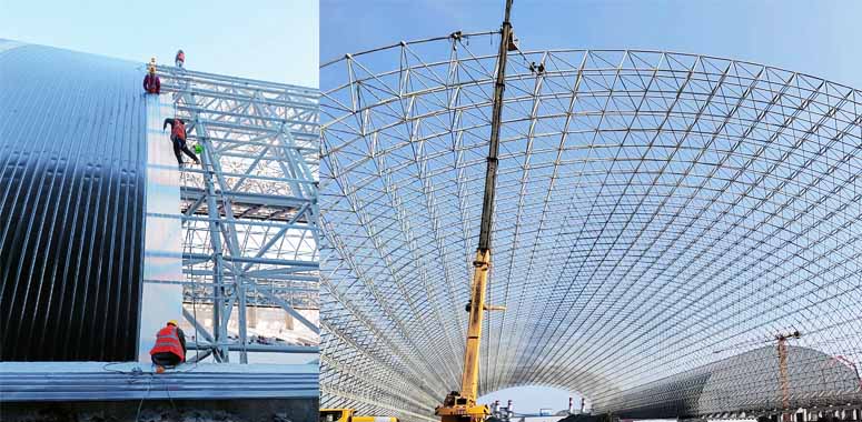 Steel structures are shipped via bulk carriers with reinforced packaging, while cladding materials are containerized for protection.